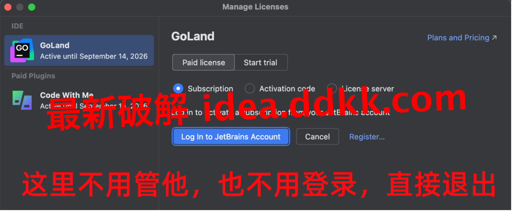GoLand安装好之后,第一次启动会弹出登录界面。这时候你可能手痒难耐,想马上登录试试,但是兄弟们,千万别着急!
