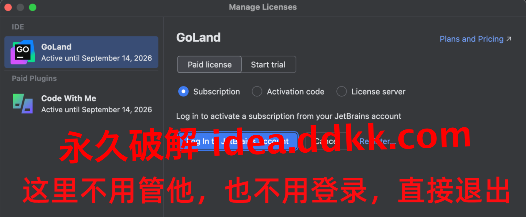 所以看到登录界面,直接点 Exit 退出 GoLand,什么都别动;咱先把破解补丁装上,搞定激活之后再重新打开软件,那时候就能直接用了,不需要登录任何账号