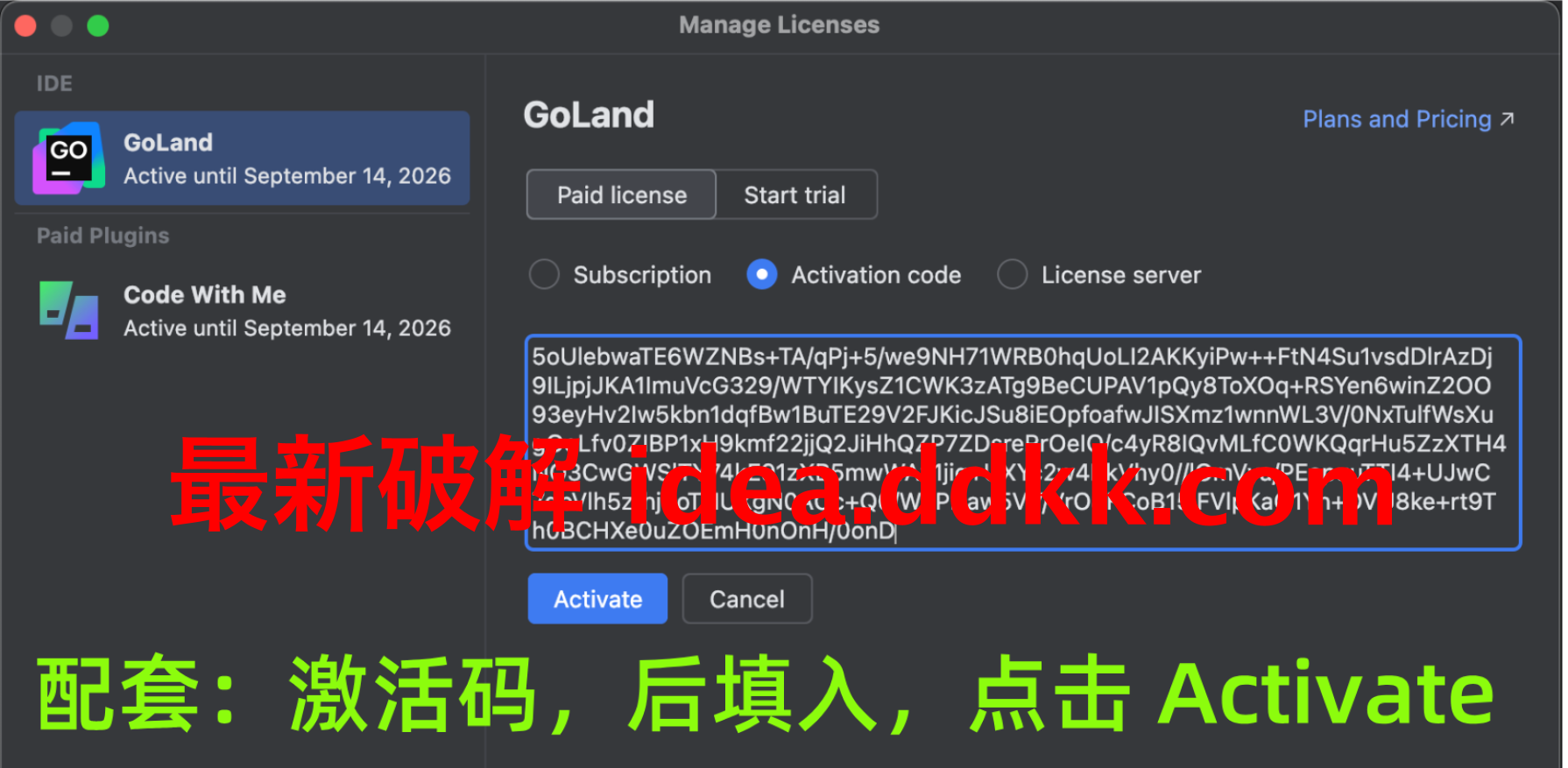 补丁装好后,重新打开 GoLand,这次它还是会弹激活窗口,但咱不用登账号了;直接选择 "Activation Code" 这个选项,也就是用激活码的方式来激活