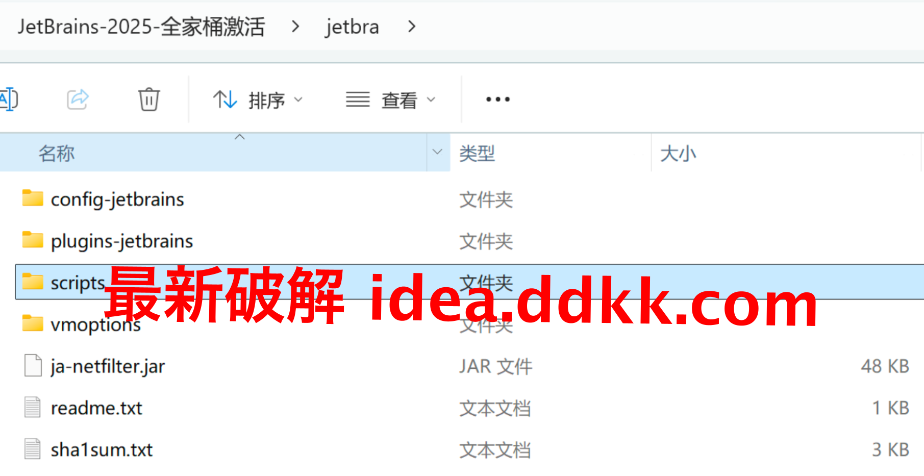 把刚才解压的jetbra文件夹打开(记住这文件夹得放在全英文路径),进入scripts目录,根据你的系统选对应的脚本文件:
