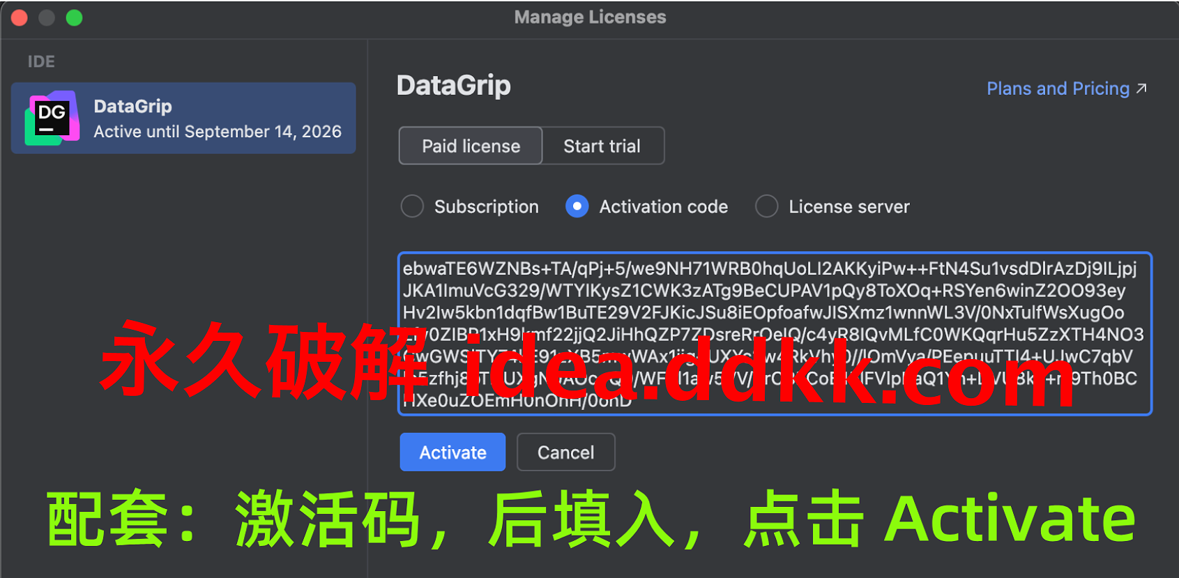 这里要说一句:JetBrains家的每个产品激活码都不通用,DataGrip的码只能给DataGrip用,IDEA、PyCharm这些都有各自的码。