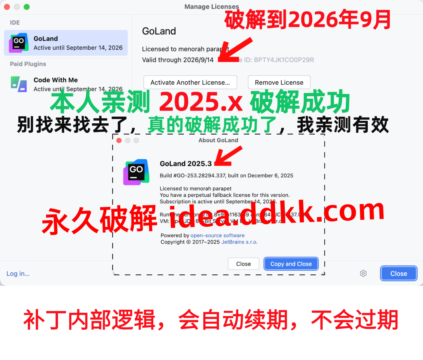 好了,整个破解流程就这些。按步骤来,别跳步骤,别乱改路径,基本都能成功;补丁装好后记得别删,也别移动位置,不然激活就失效了。有啥问题多检查几遍路径和版本,大部分问题都是这些细节没注意导致的。整完就能愉快地写Go代码了,不用再担心到期问题。干就完了,别问为啥,照抄稳过。