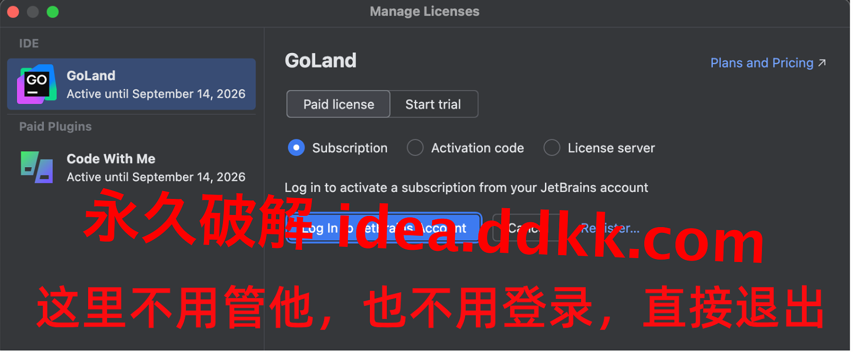 GoLand装好第一次启动,会弹出来一个登录界面,让你登录JetBrains账号。这时候千万别手快直接点登录,咱还没破解呢,登录了也没用。