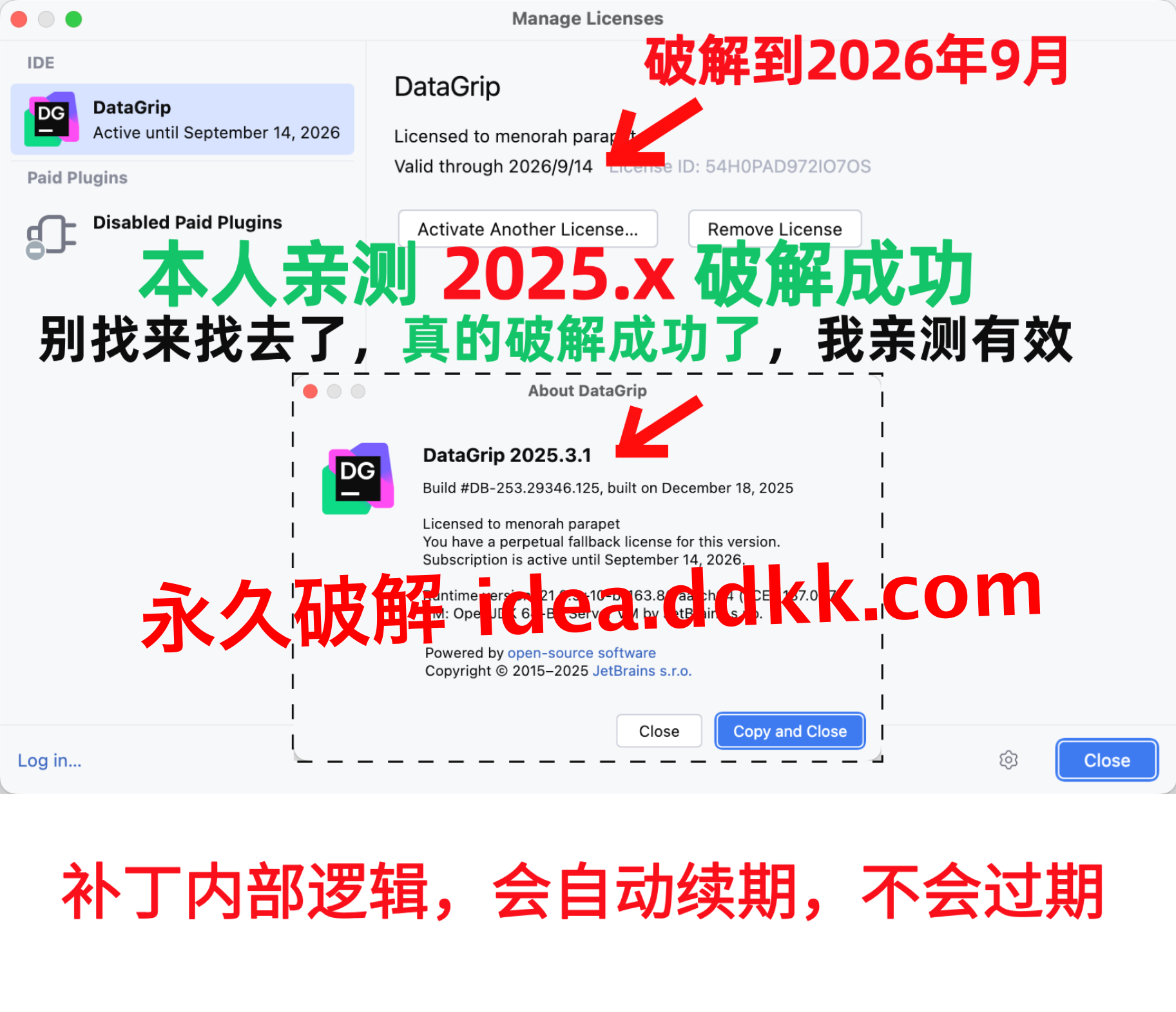 另外,确保你用的补丁和激活码都是最新版本的,老版本可能跟新版本的DataGrip不兼容,会激活失败,我鹏磊提供的资源都是专门针对2025.3.1版本的,其他版本不一定能正常使用。