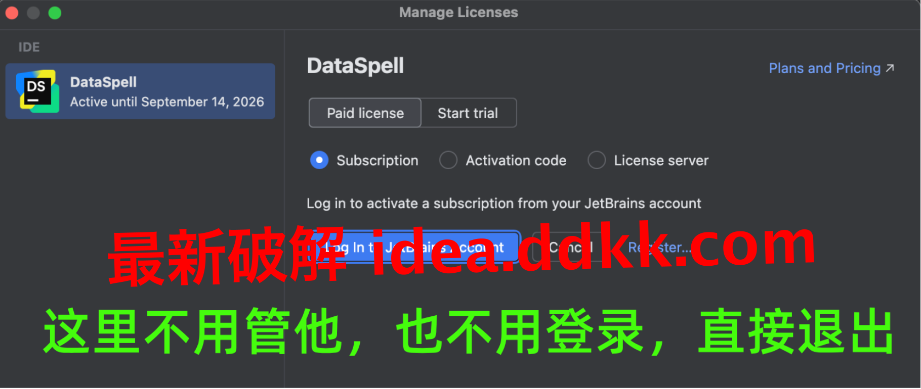 补丁装到位,重开DataSpell,到激活界面选激活码方式,不是试用也不是账号登录,就是激活码。
