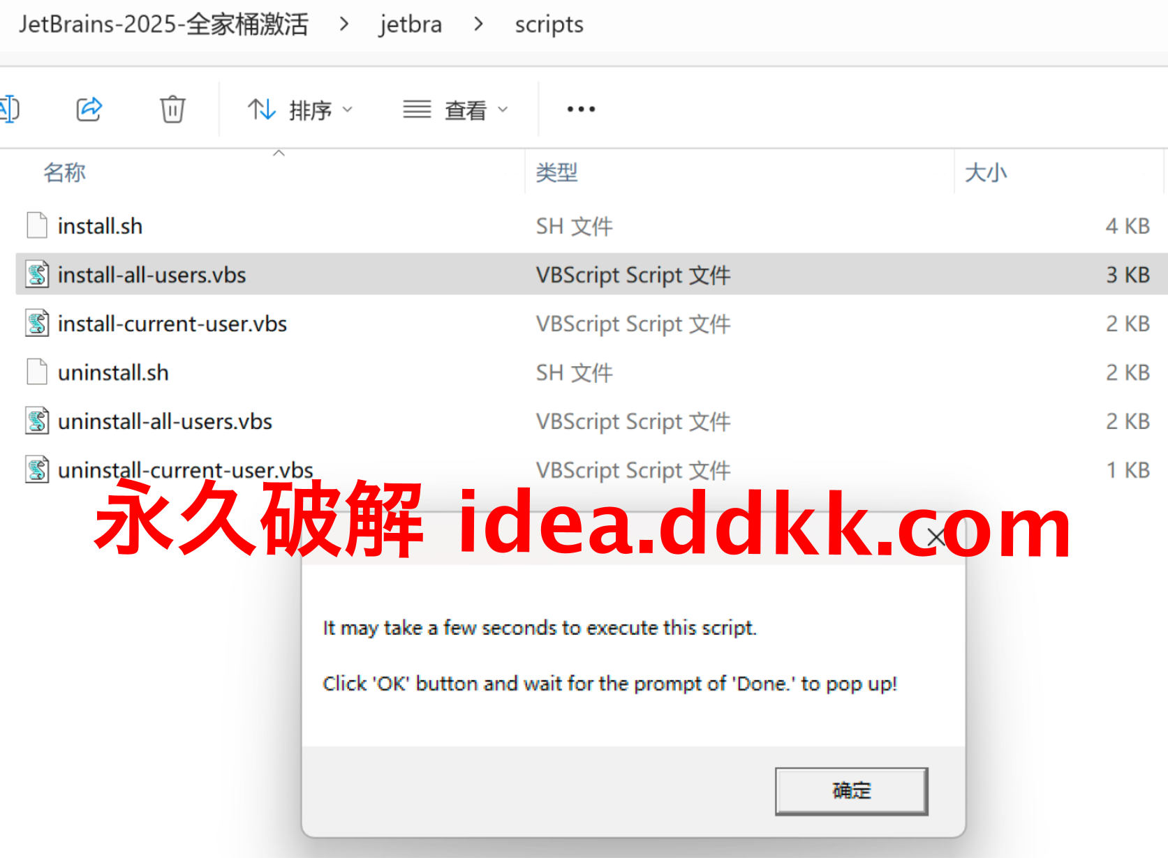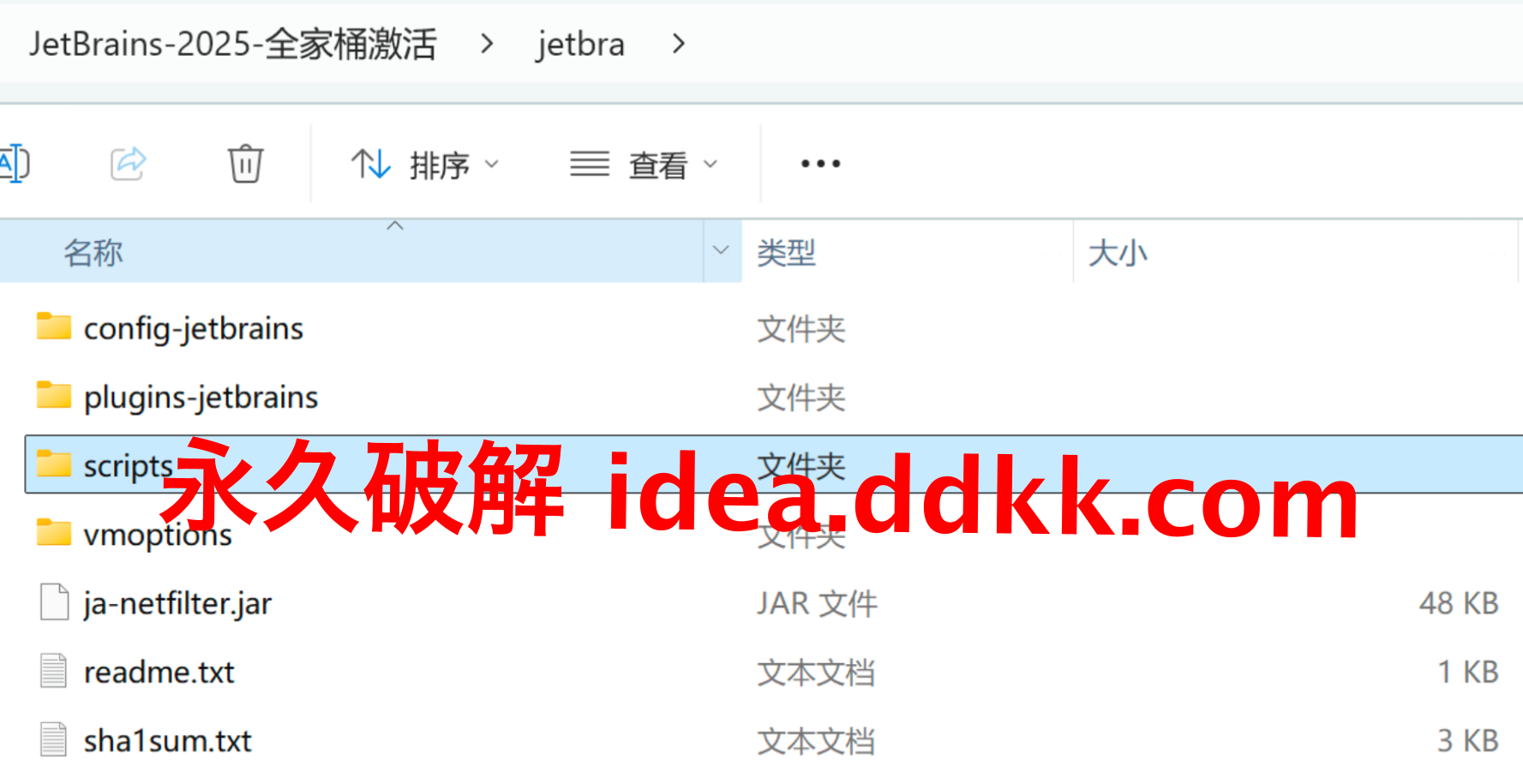 解压出来的目录,scripts 在里头,记住整个 jetbra 文件夹放在哪个纯英文路径下,这个位置之后不能移动。