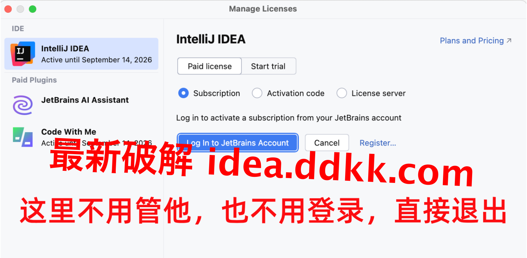 IDEA装好之后,第一次打开会弹出一个对话框,让你登录JetBrains账号。你瞅瞅,这界面是不是看着就想点登录?手痒难耐我理解,但千万别手快直接点登录。