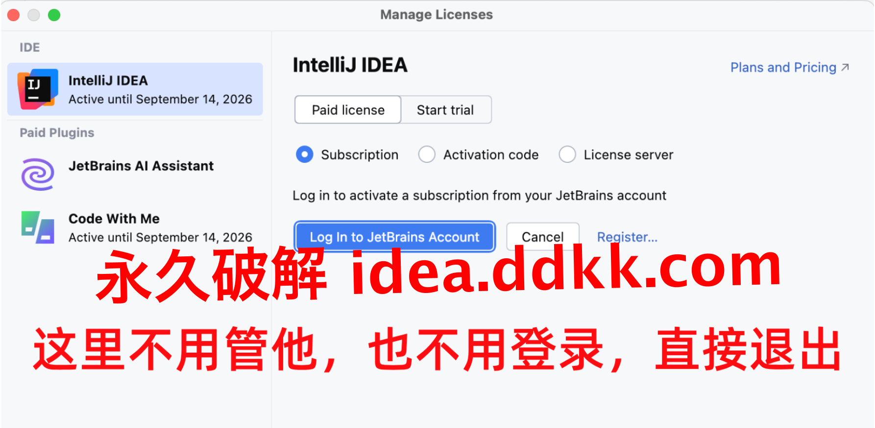 官网下 IDEA 2026.1 安装包,装好,这块不细说。装完第一次打开,软件立刻弹出一个窗口,让你选激活方式:登录账号或者手动填激活码。