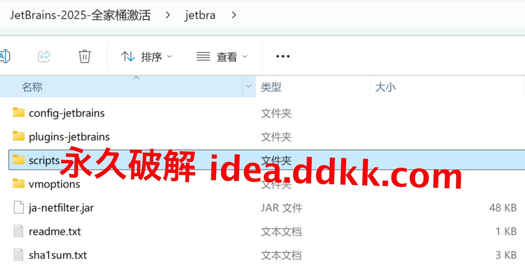 压缩包解开来,里面核心是一个 scripts 文件夹,里面放了不同操作系统的安装脚本:Windows、Mac、Linux 都有,各自对应,不用担心系统不支持。脚本的作用是把破解补丁的路径自动写进 IDEA 的 vmoptions 配置文件,全程自动处理,不用你手动翻配置文件改东西,小白也能跟上。