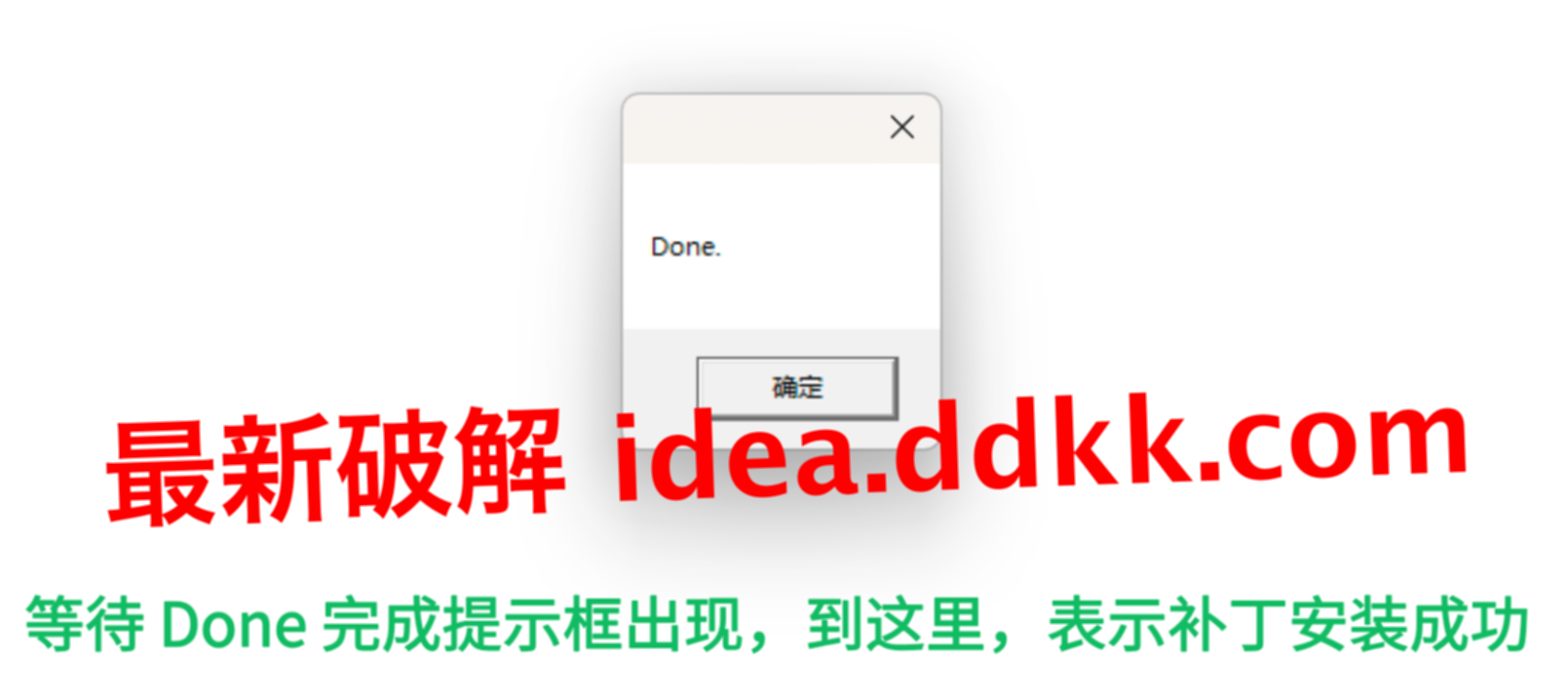 跑完先弹出确认框,点确定,然后接着等——那个完成状态的弹框一出现,说明补丁成功写进 IDEA 配置,这步到此为止。