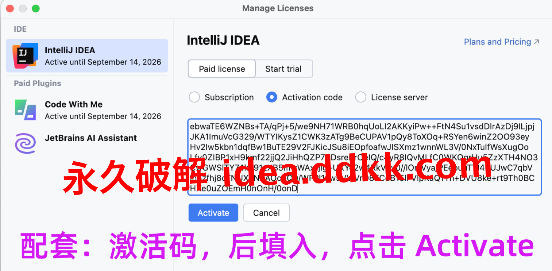 补丁搞定,现在去填激活码。顺带说一下:IDEA 有 IDEA 专属的激活码,JetBrains 旗下每款软件激活码都是独立的,跨产品不能通用,别把 GoLand 或者 PyCharm 的码拿来 IDEA 里填,验证过不了。