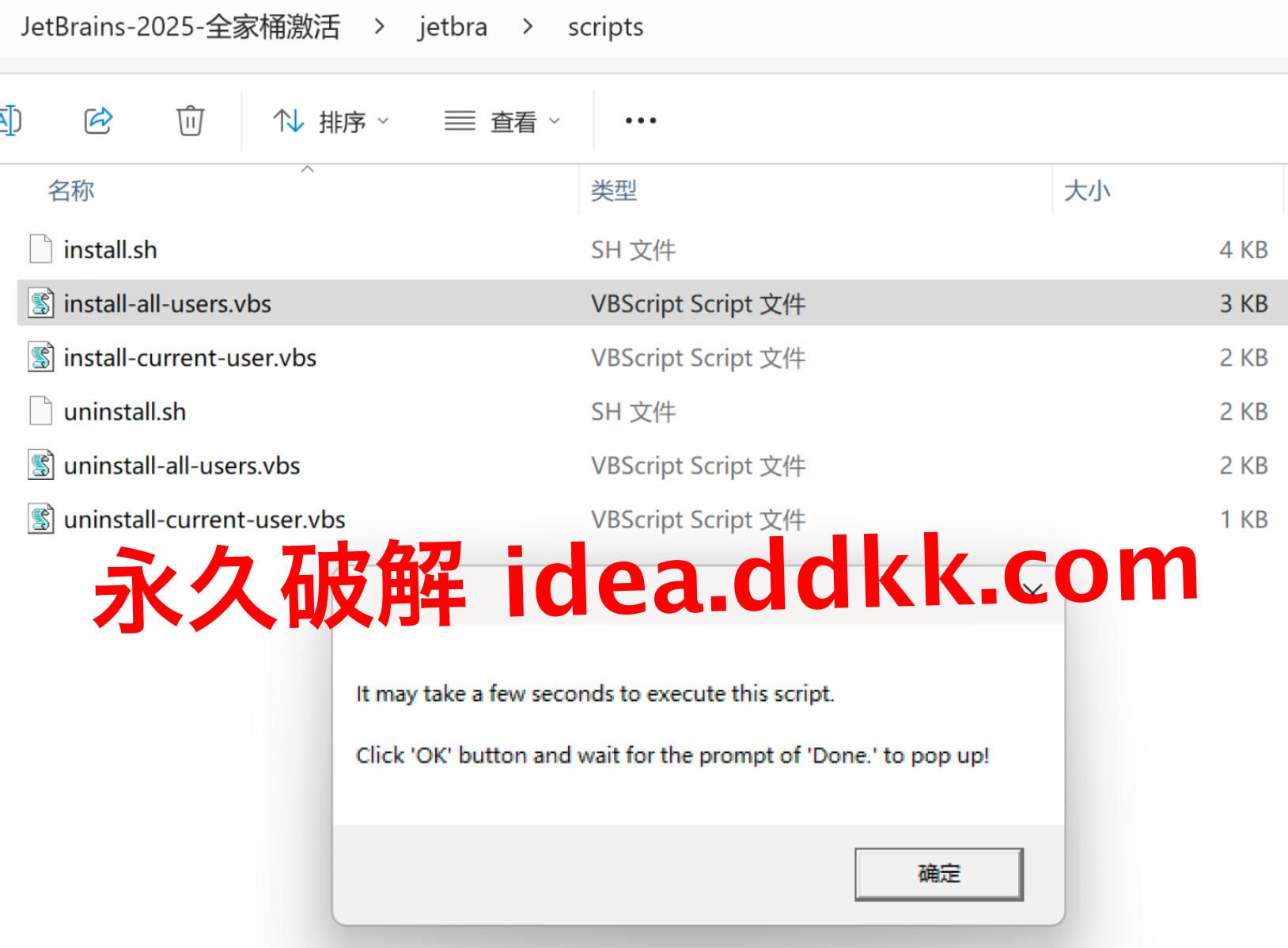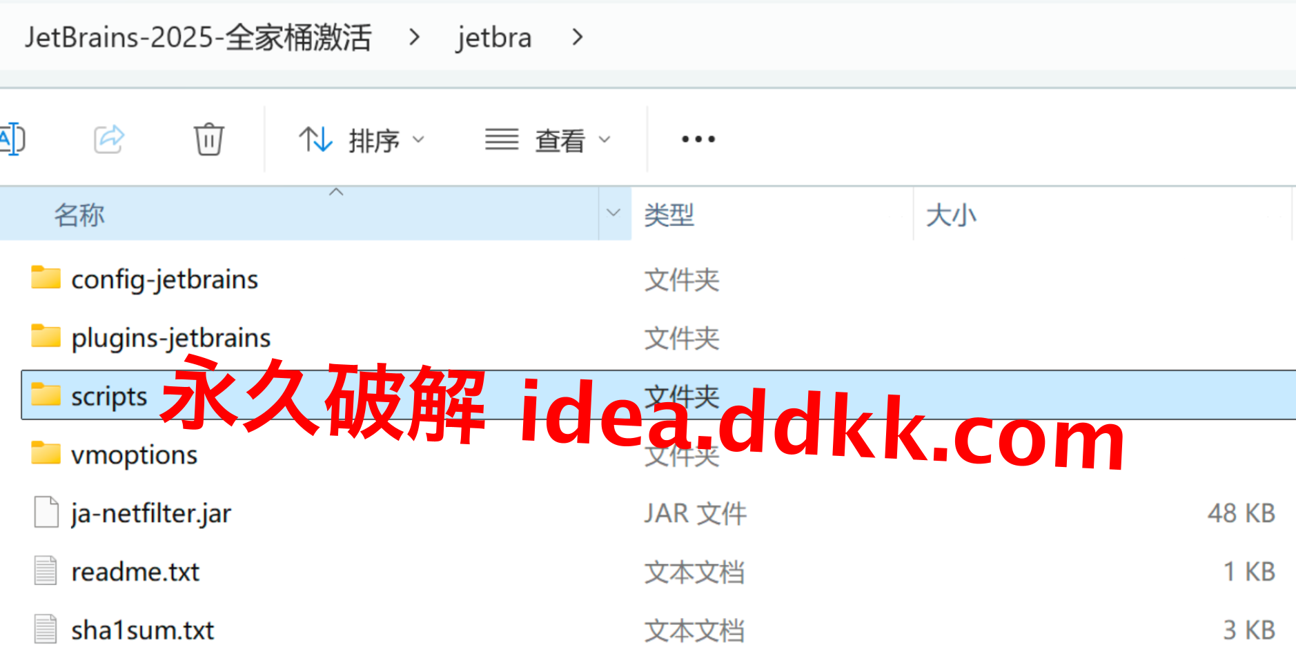解压出来的目录,scripts 文件夹在里头,记住整个 jetbra 文件夹放在哪个英文路径,这个位置后面不能动。