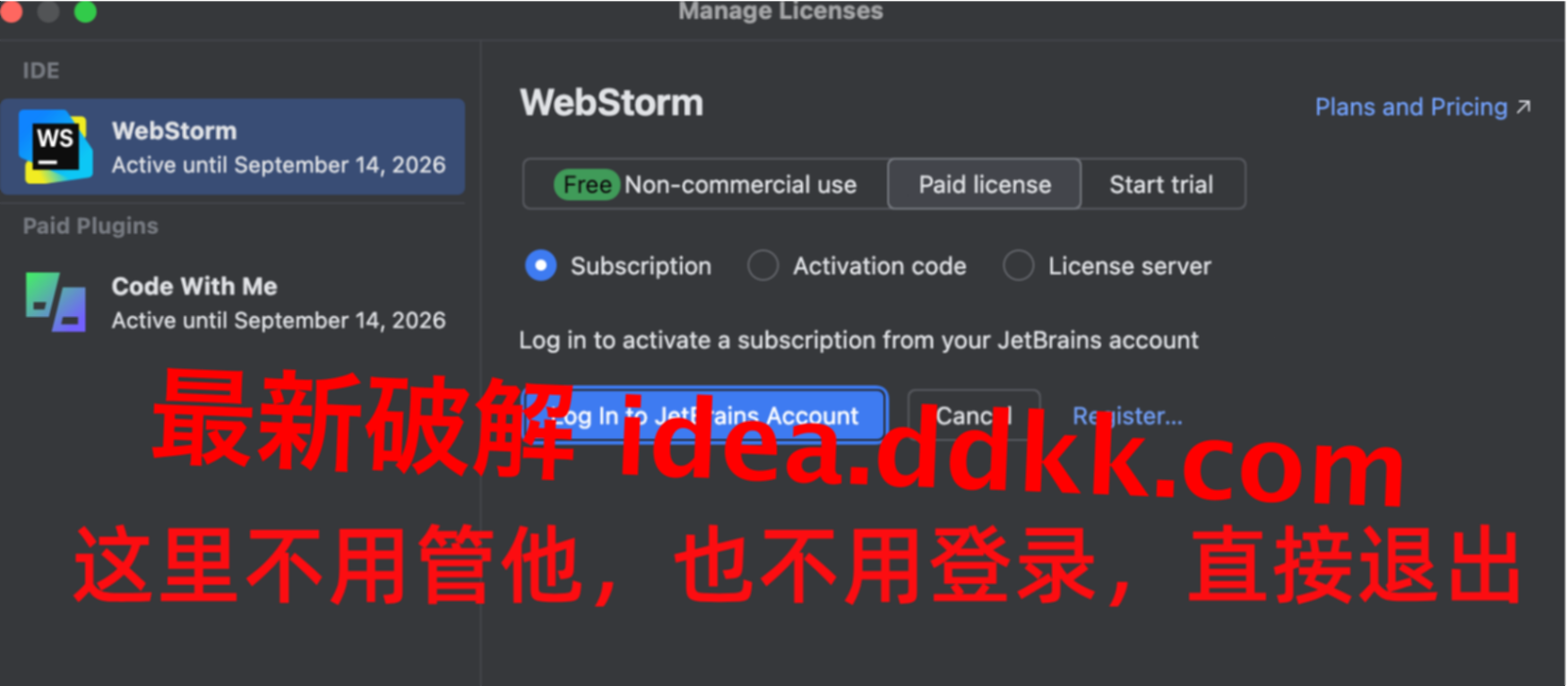 WebStorm装好第一次打开,会跳出来一个登录窗口,让你登录JetBrains账号,这时候别慌,也别急着填账号密码。